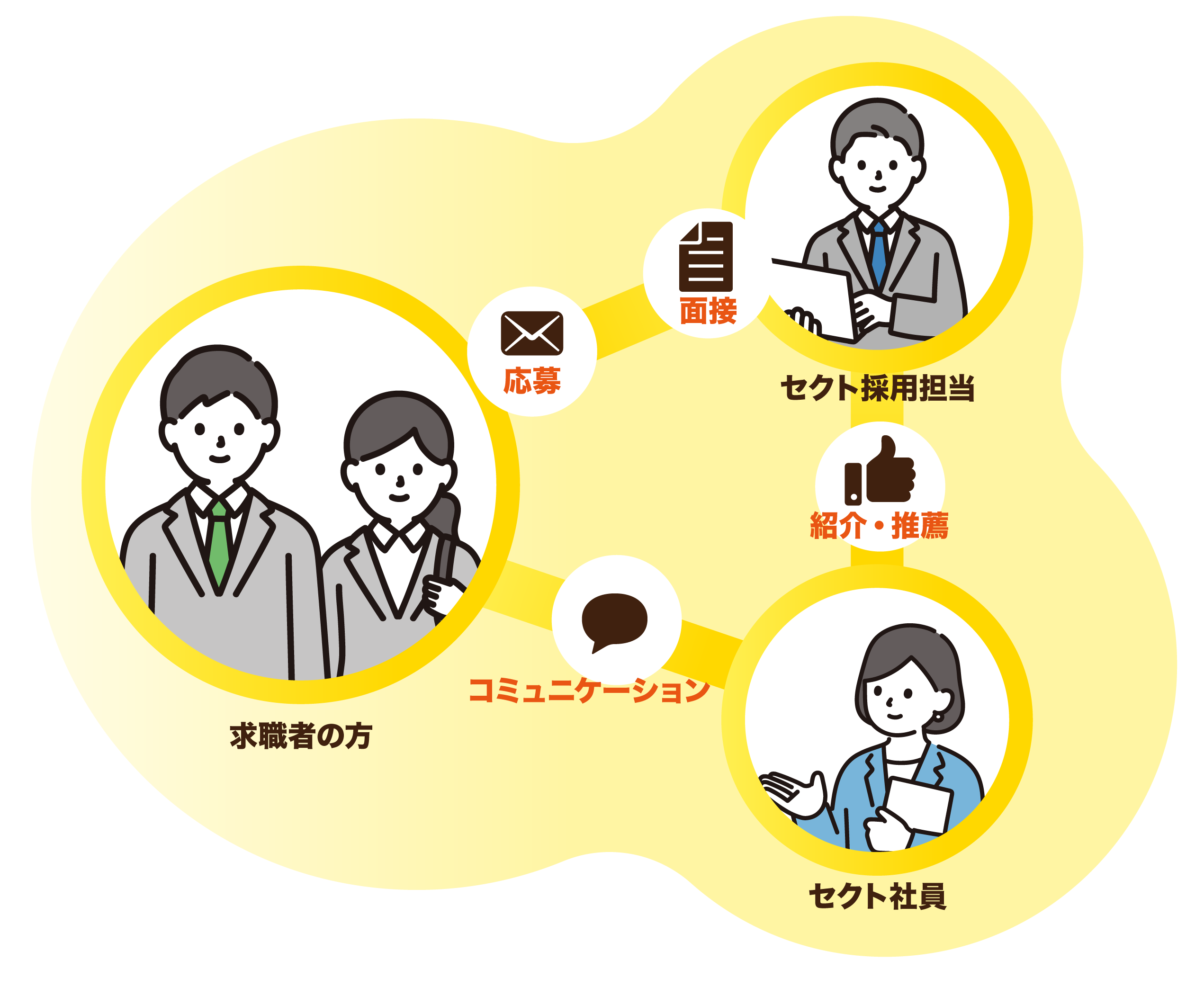 リファラル採用とは、セクト社員が知人・友人に自社を紹介後、入社いただく採用制度です。